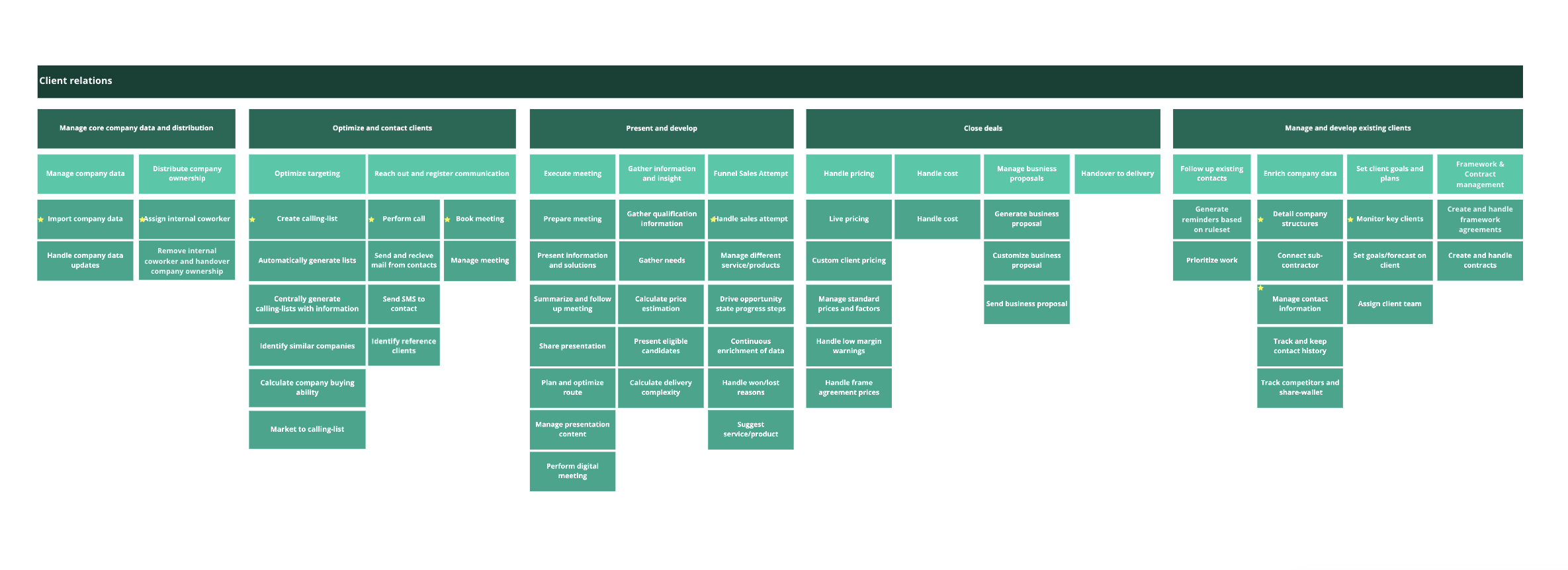 A new CRM tool was like stumbling upon something as big as a mammoth. So, together with our stakeholders, we broke it down to smaller chunks to be able to see the whole picture. The chunks being the capabilities that we discussed and prioritised. For example “perform meeting” or “perform call” went under the category “Optimise and contact clients”.