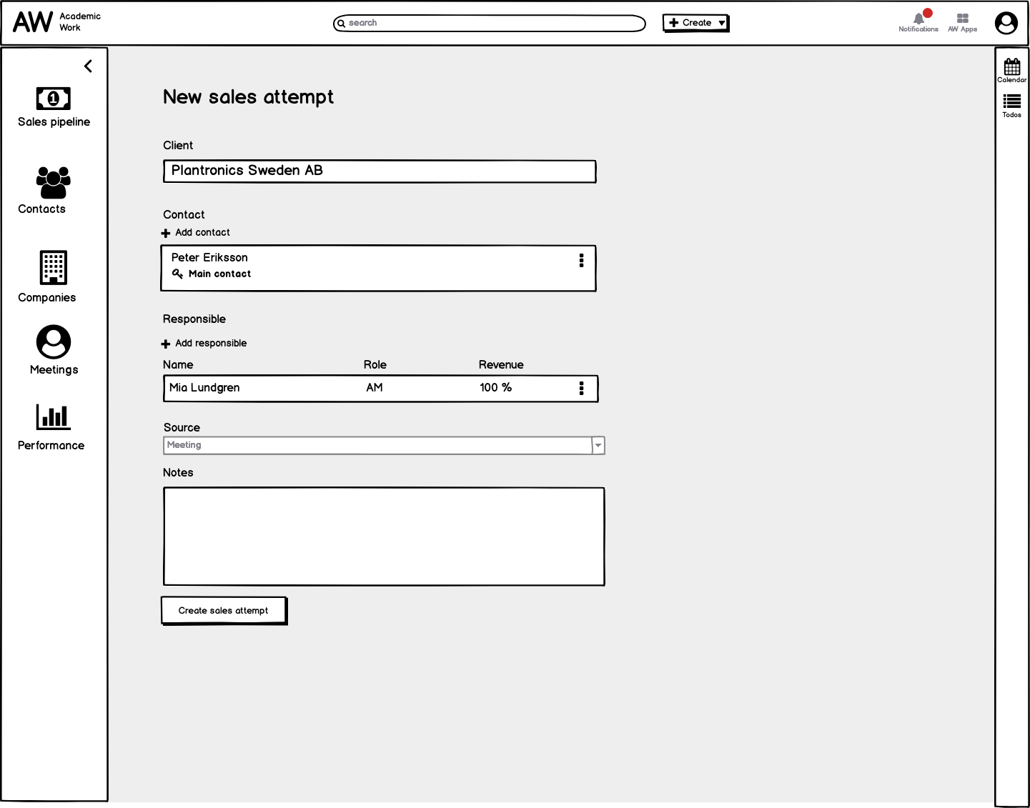 To further clarify, we designed for the sales process from finding a potential client, call and perform a meeting. We integrated a client database enabling them to search for available companies and contacts and a way for them to handle their todo's. These two are one of the main designs that we believed would solve both user and business needs.