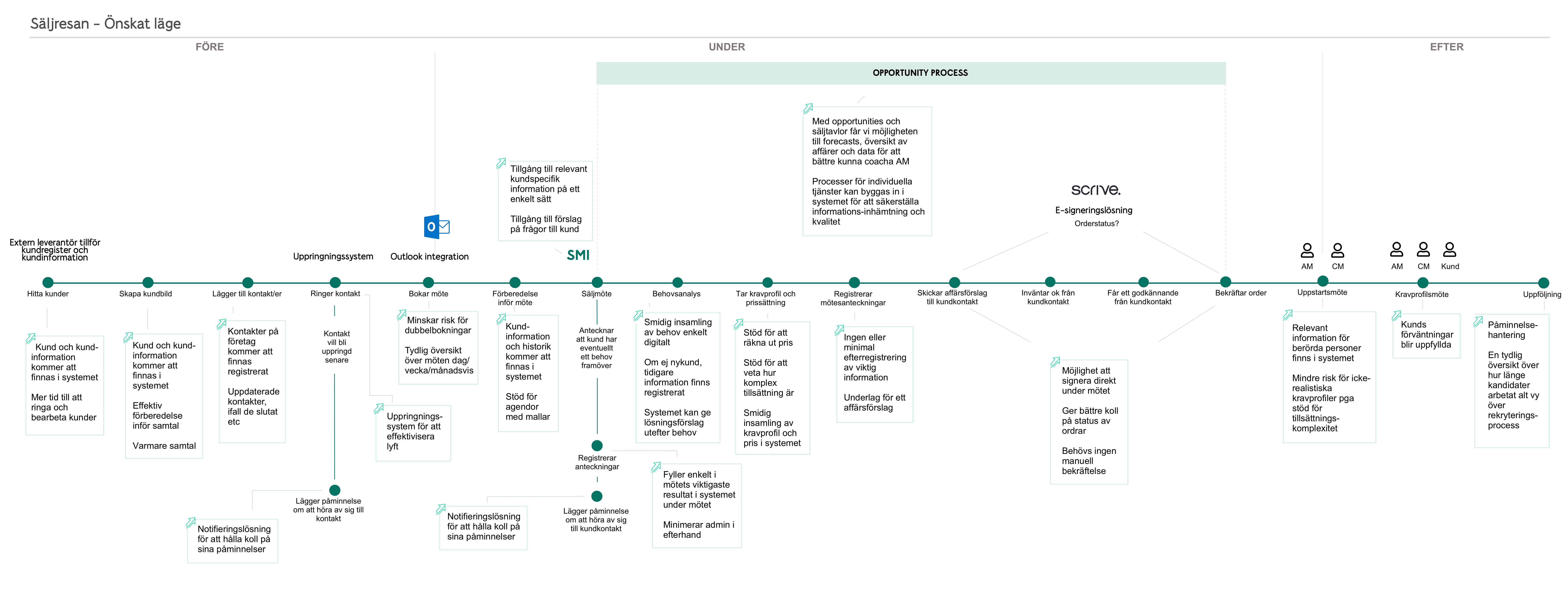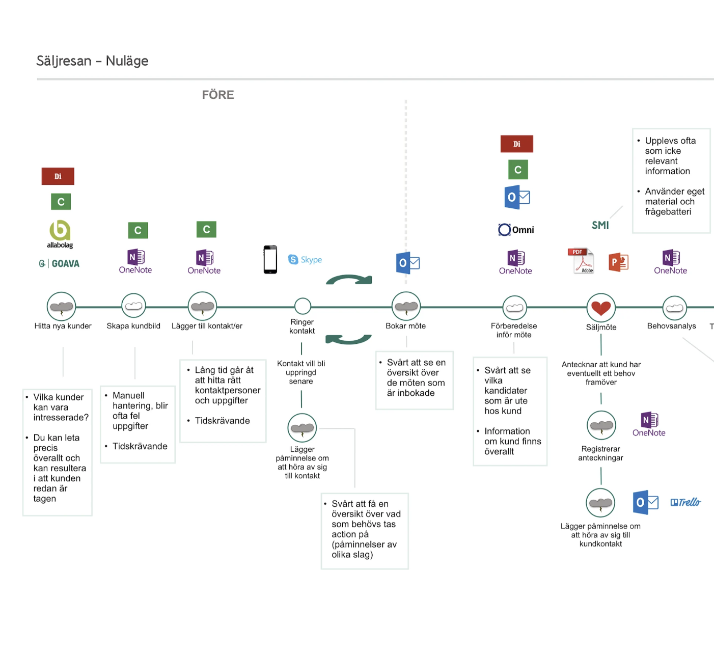 Below is a picture of a part of the account manager sales journey, created from several interviews and observations done with the team and stakeholders. Different applications are used for the steps from finding a potential client to performing a meeting. The “C” icon is the current sales system.