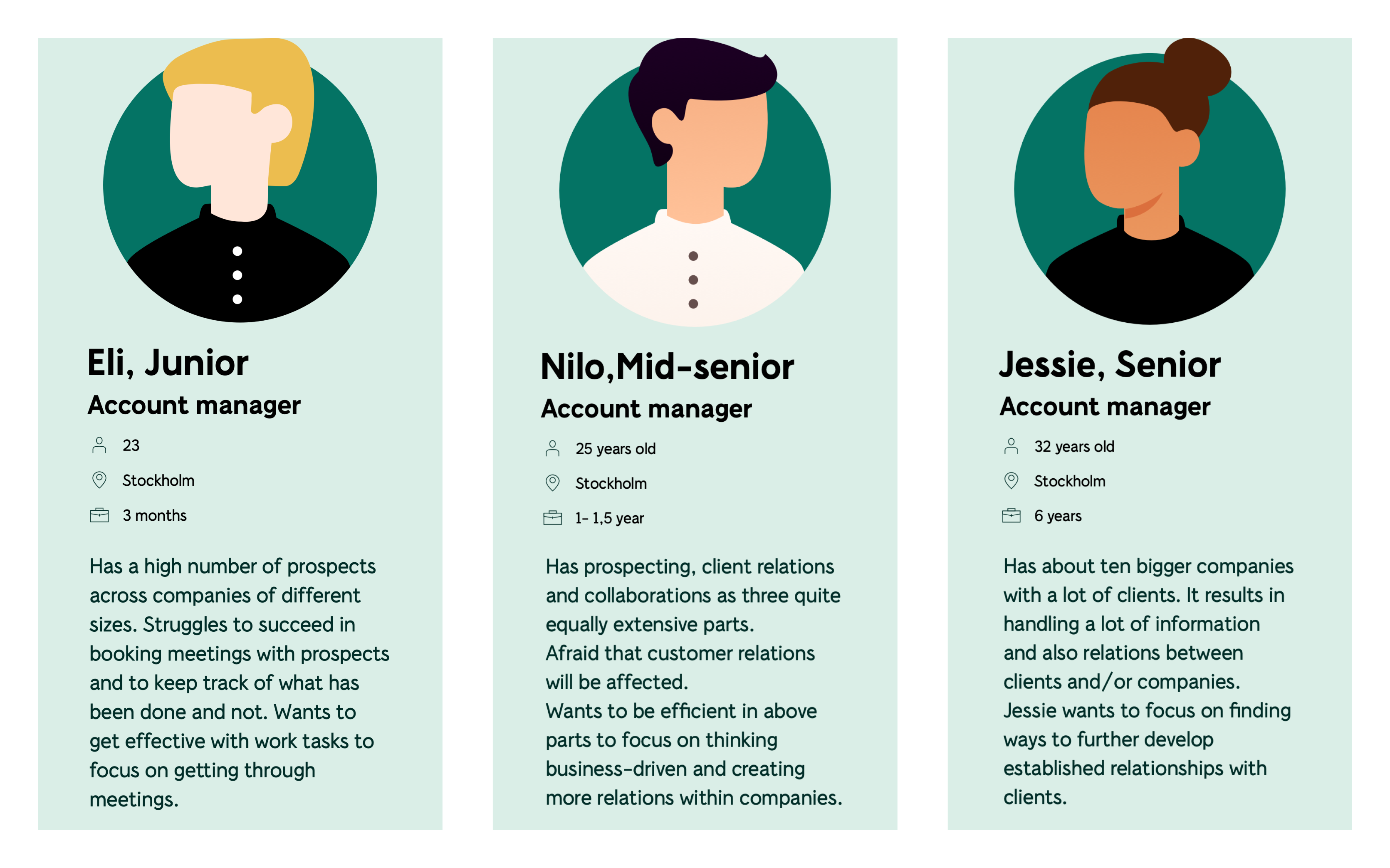 Beyond functionality and new super CRM, I believe in empathy and understanding of the user's needs which is also the basis of a good vision. And to the frustration of us designers, reports or longer summaries from research results tend to get dusty in a folder somewhere after being presented. So, from research we designed three personas that would represent our sales people and that we went back to when designing flows and making various design decisions.