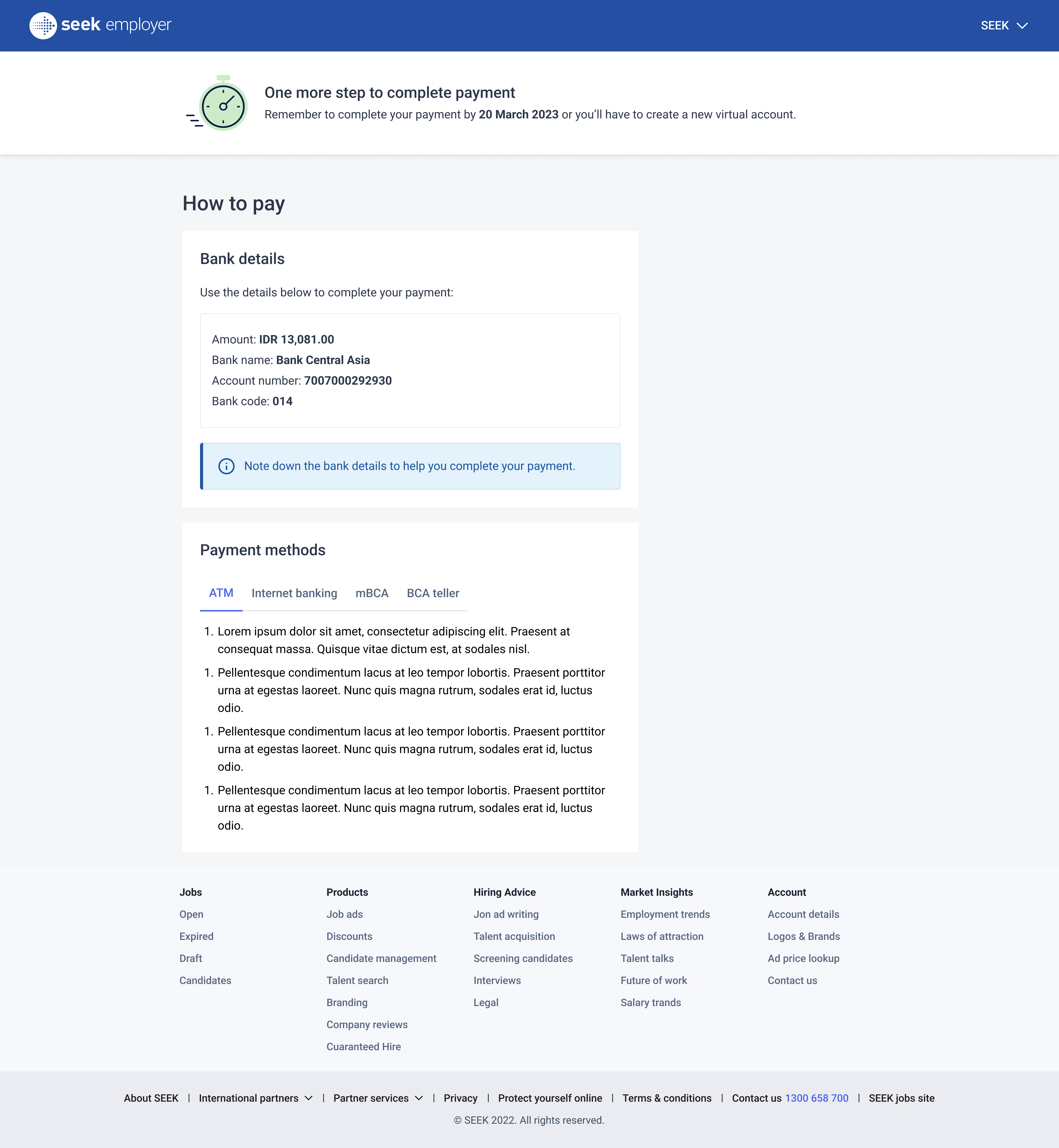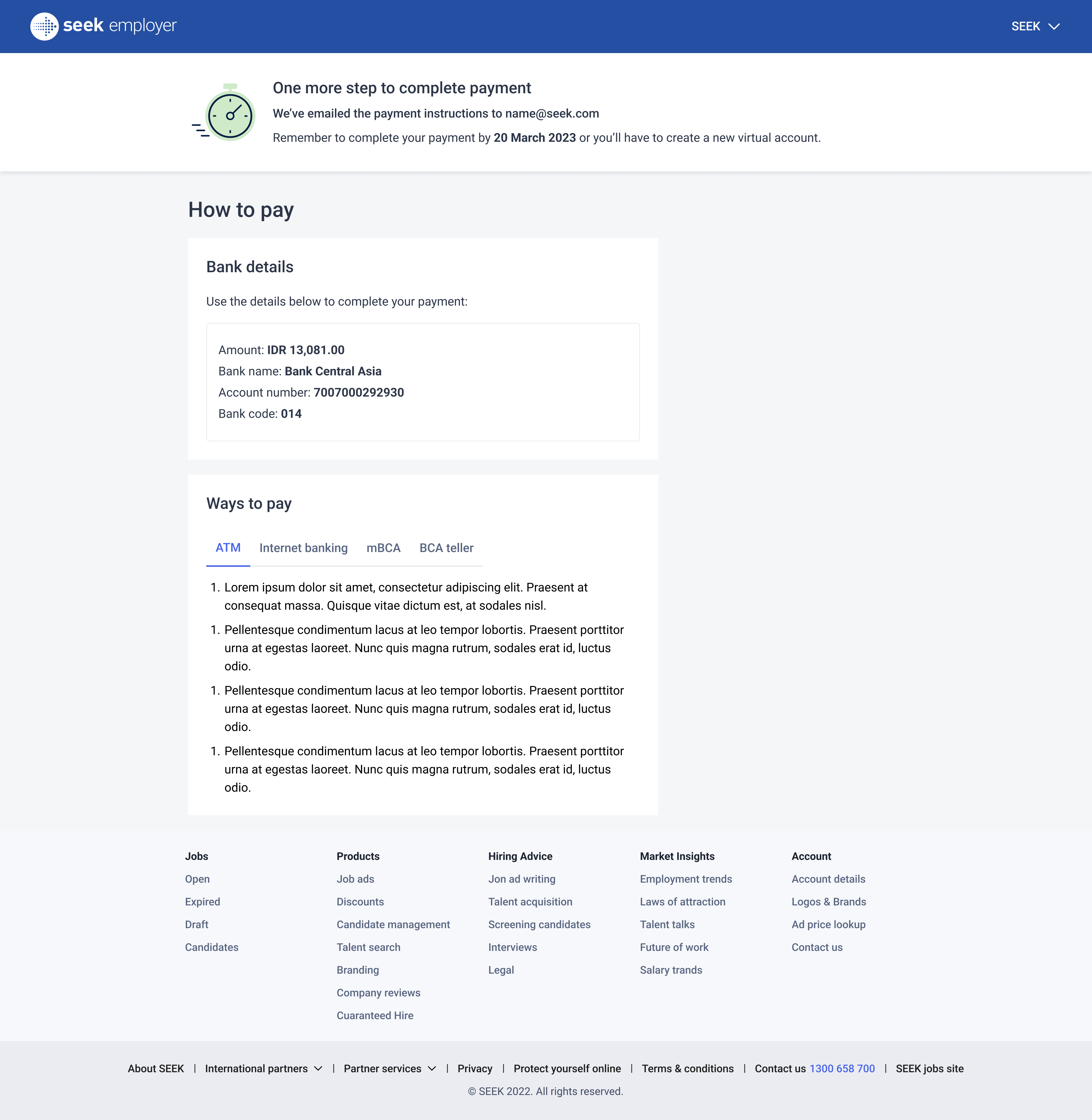 So in my case, I made sure payment options for ASIA hirers were available for them to pay their invoices, connected to the look and feel to the rest of the website and drove the discussion to make improvements on the payment option "Virtual account" for Indonesia.